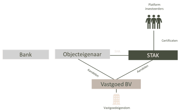Beleggers nemen niet rechtstreeks aandelen in de vastgoed B.V. Om versnippering van zeggenschap en complexe administratie te voorkomen, wordt gewerkt met een coöperatie en/of STAK (Stichting Administratiekantoor).
